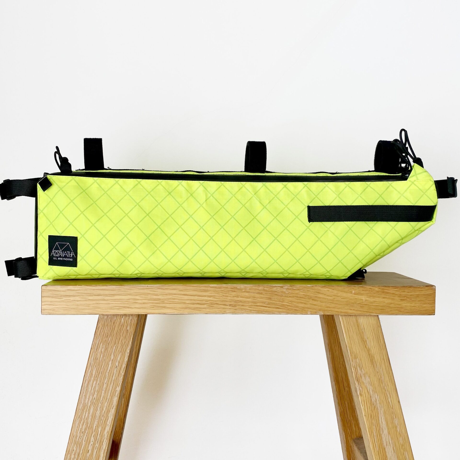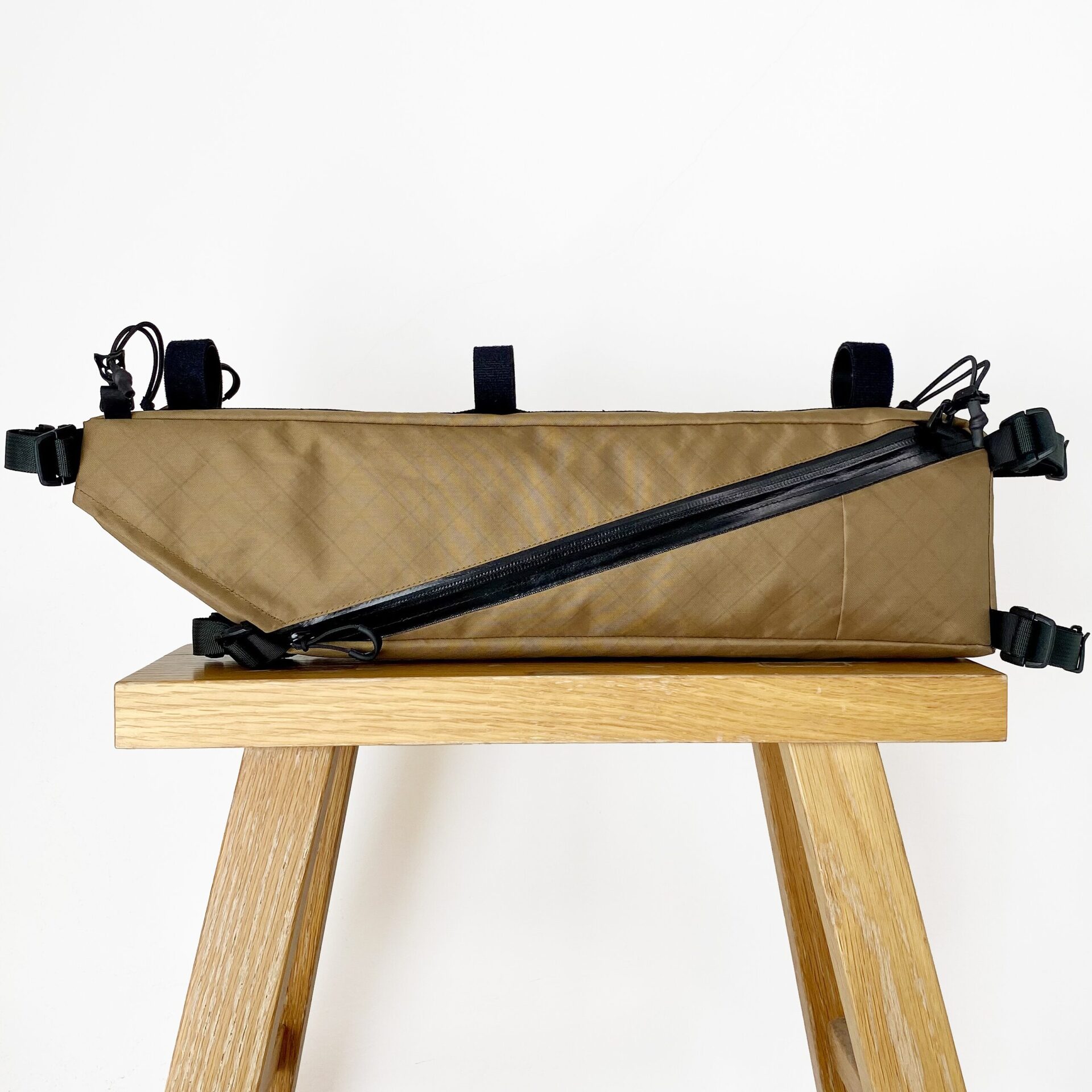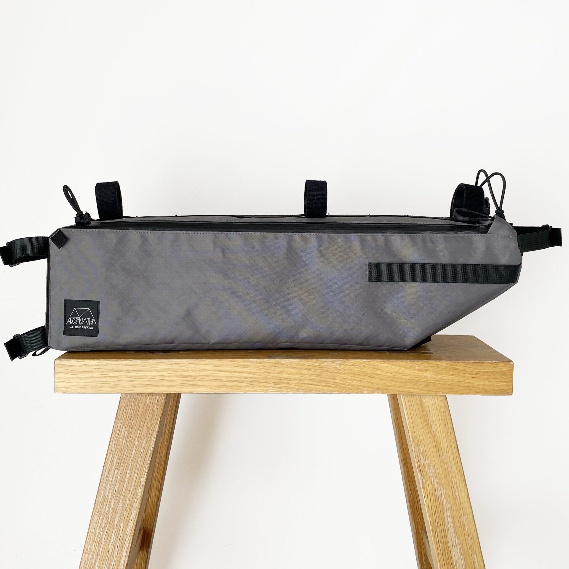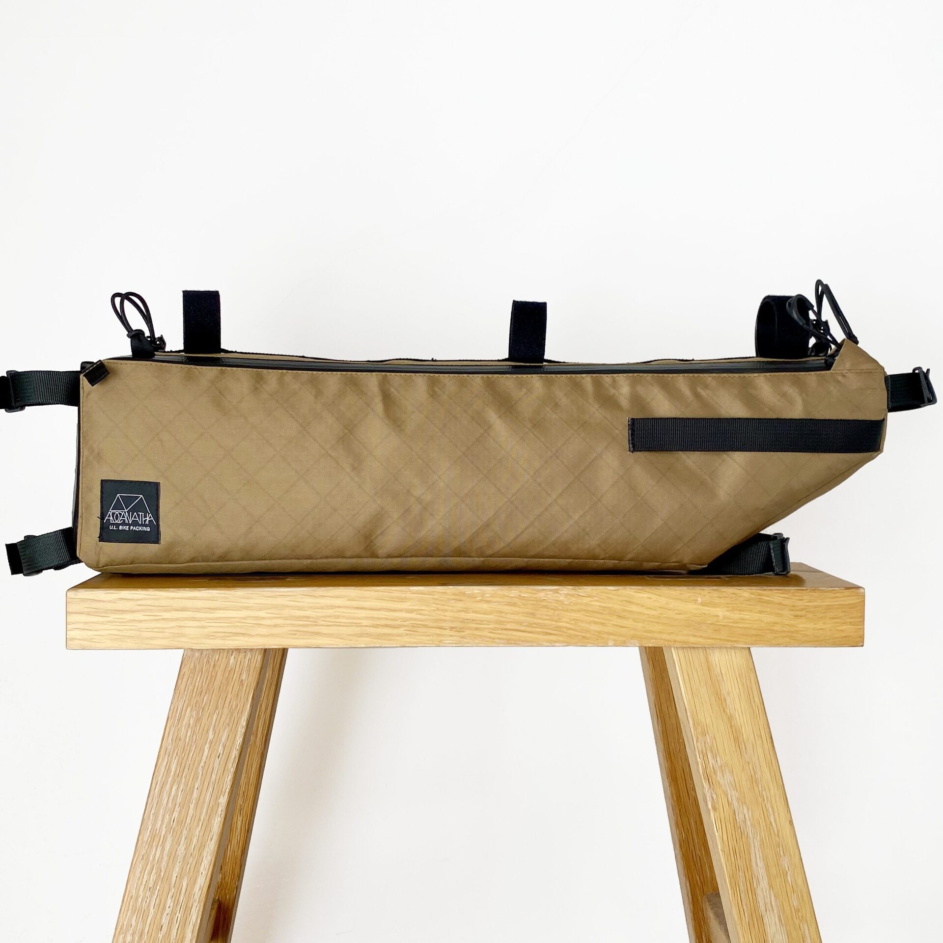 バイクパッキングに特化したフレームバッグ。 取り出し口がL字に大きく開くため焚き火五徳や細長いポールの出し入れが容易で、内部には荷物を固定する複数のエラスティック・ストラップを配しています。 バッグ上部のバンジーコードはトレッキングポールやタープポール、ロッドを固定することが可能。