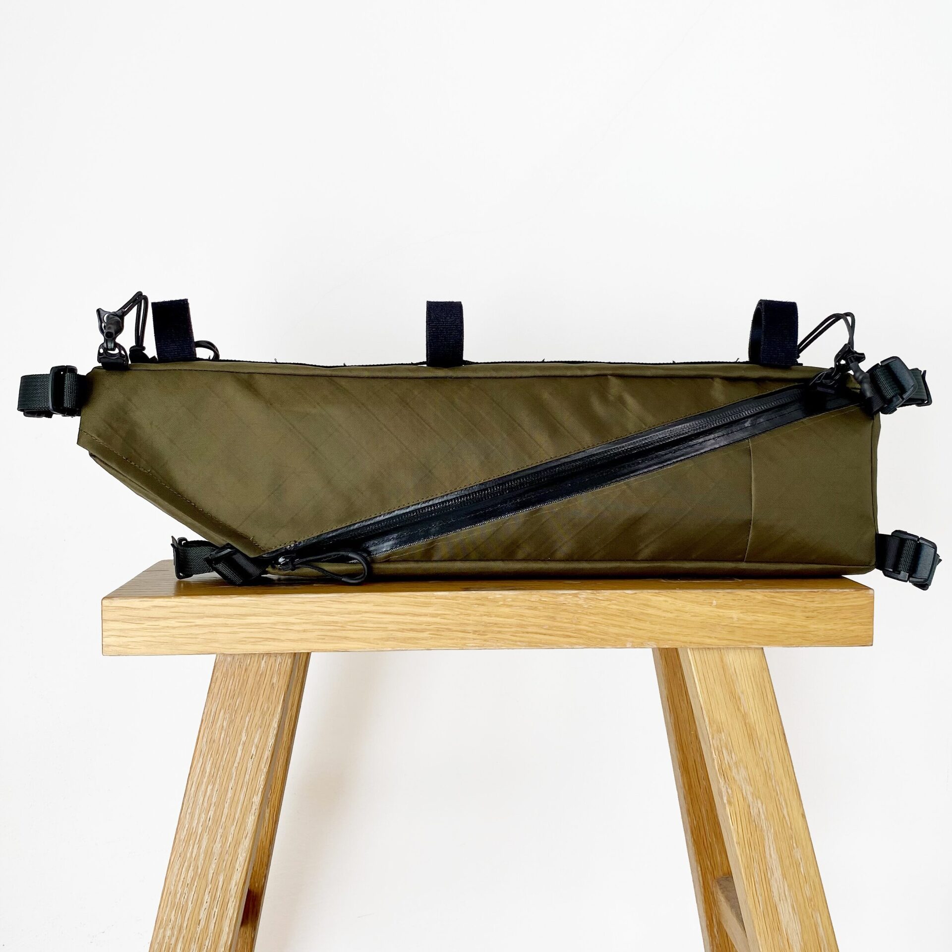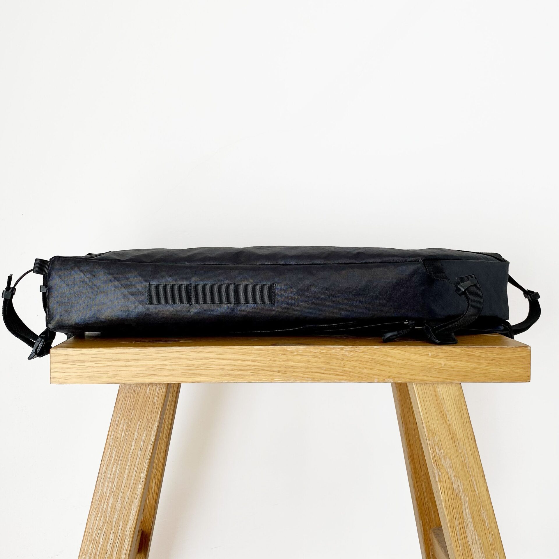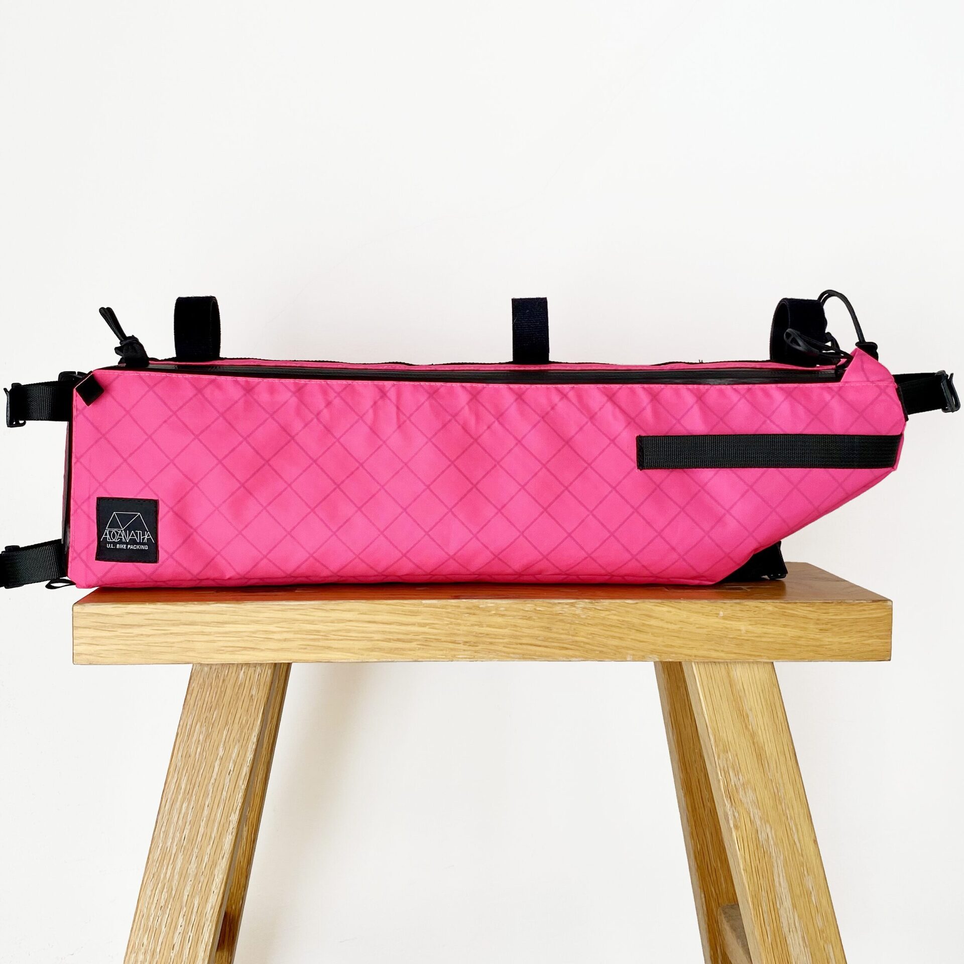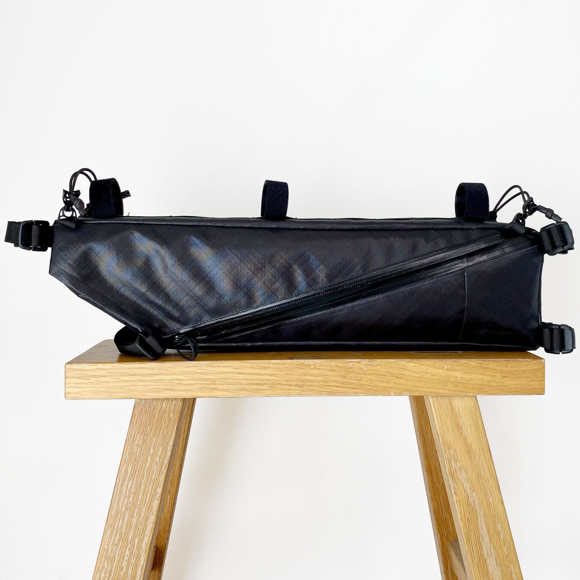 バイクパッキングに特化したフレームバッグ。 取り出し口がL字に大きく開くため焚き火五徳や細長いポールの出し入れが容易で、内部には荷物を固定する複数のエラスティック・ストラップを配しています。 バッグ上部のバンジーコードはトレッキングポールやタープポール、ロッドを固定することが可能。