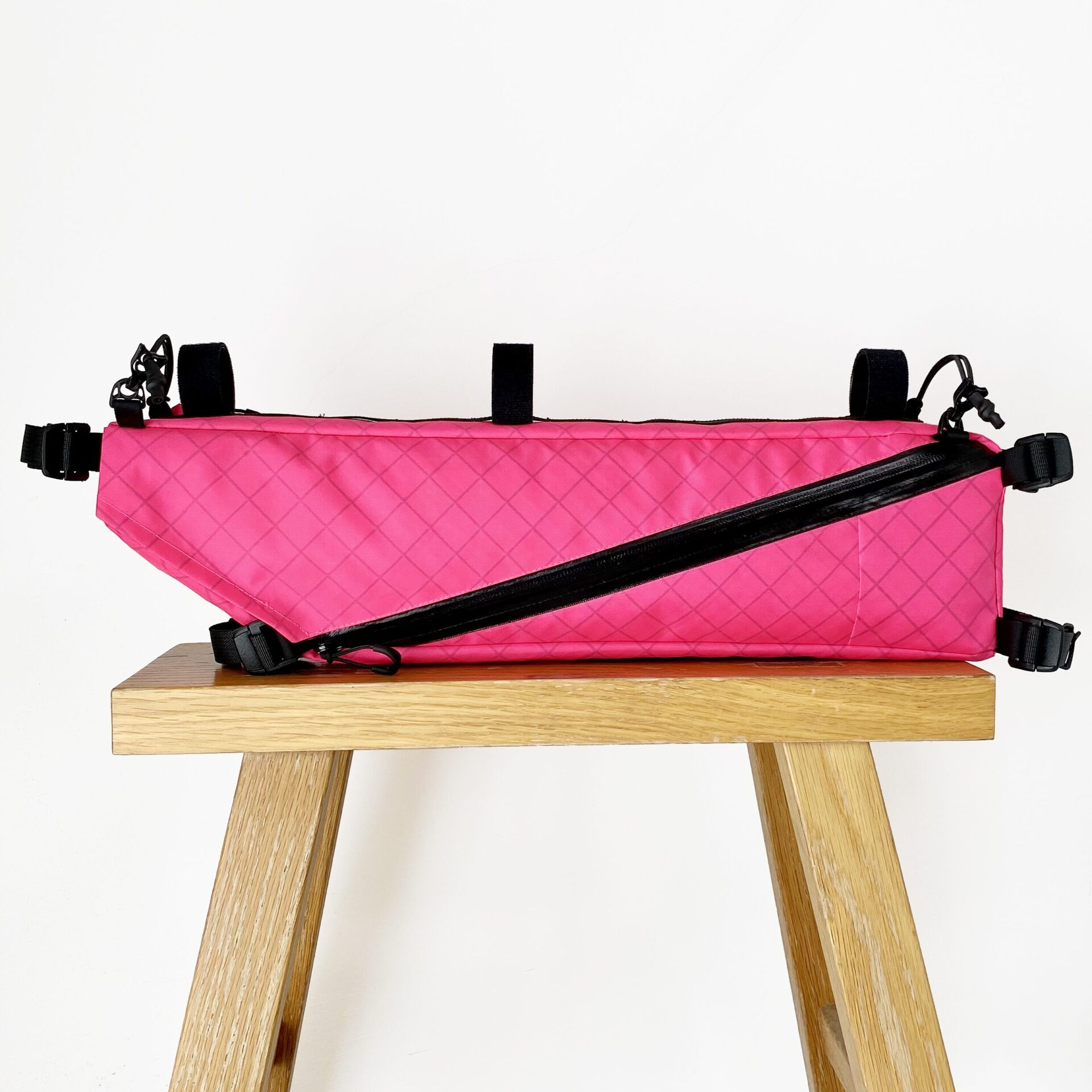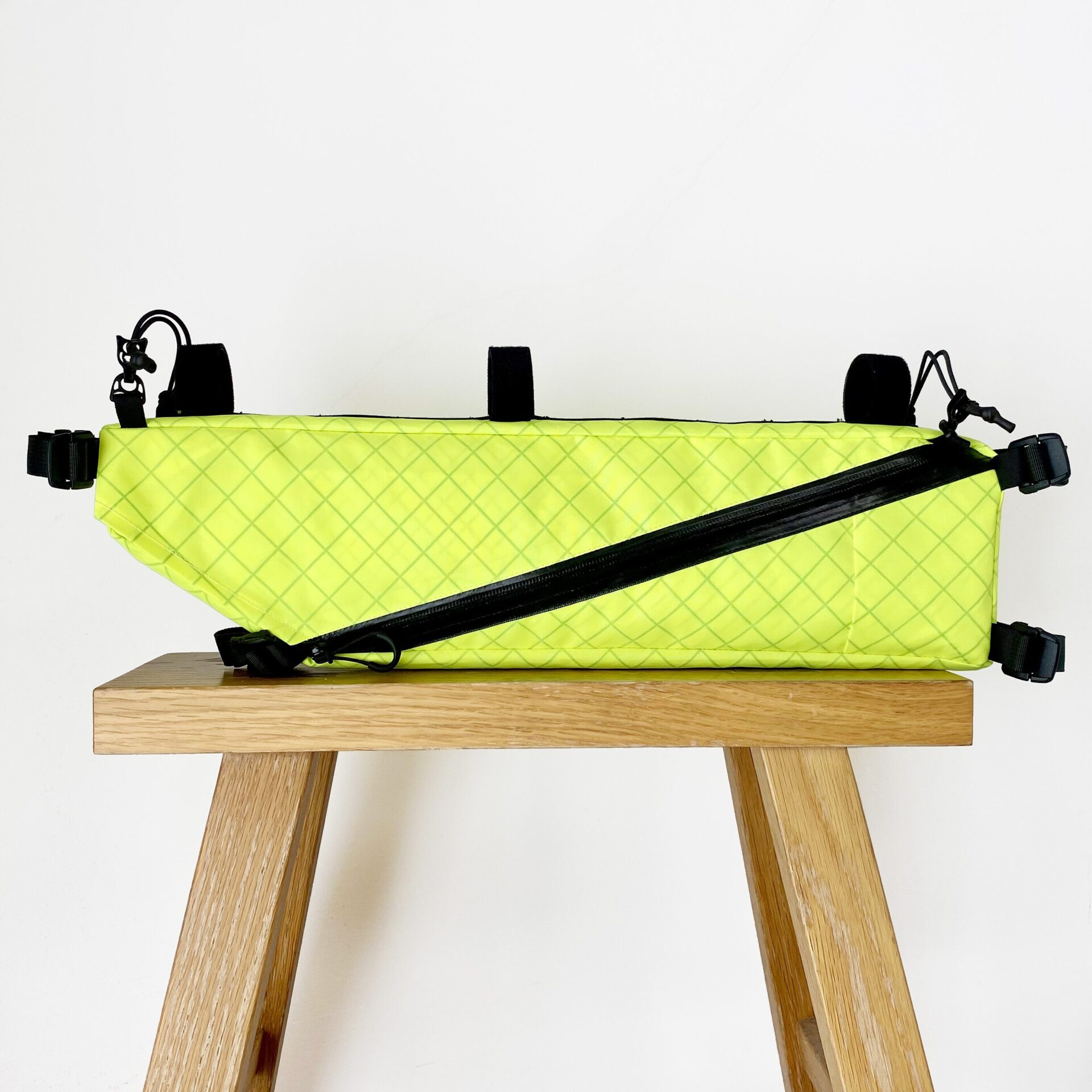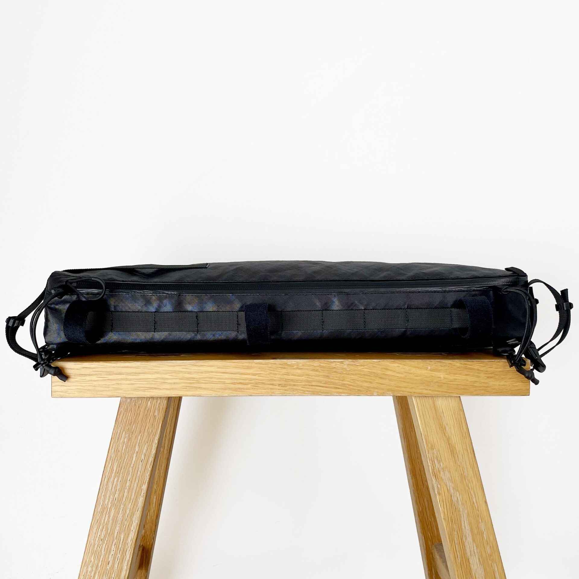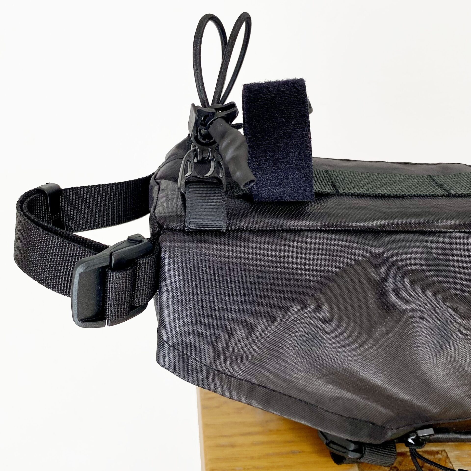 バイクパッキングに特化したフレームバッグ。 取り出し口がL字に大きく開くため焚き火五徳や細長いポールの出し入れが容易で、内部には荷物を固定する複数のエラスティック・ストラップを配しています。 バッグ上部のバンジーコードはトレッキングポールやタープポール、ロッドを固定することが可能。